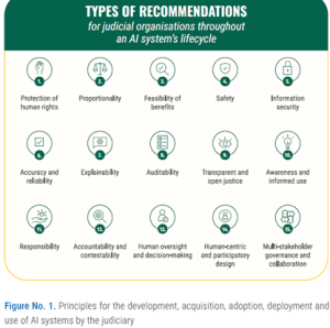 The UNESCO Guidelines for the Use of AI Systems in Courts and Tribunals[9] offer principles and specific recommendations for judicial organisations and individuals implementing AI systems, including generative AI. In this regard, ‘principles’ refer to general prescriptions intended to guide organisations and individuals in developing, acquiring, and using AI systems in an ethical manner that respects human rights.