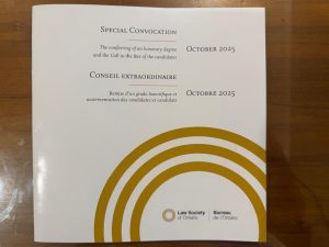 The CLA was honoured to be invited to attend the Special Convocation of the Law Society of Ontario, for the admission to the Bar of over 200 new entrants, on 27 October 2025. I was part of the platform party of Benchers and other distinguished guests, and was introduced as President of the CLA. I wish to thank Peter Wardle, Treasurer of the Law Society of Ontario, for his cordial invitation and warm hospitality.
