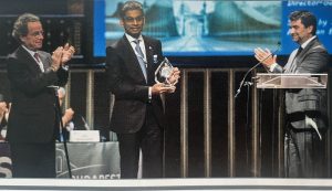 Steven Thiru, President of the Malaysian Bar (2015–2017), accepting the inaugural UIA/LexisNexis Rule of Law Award on behalf of the Malaysian Bar, on 28 October 2016 in Budapest, Hungary.